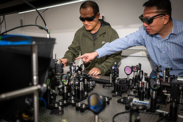 Liang Feng (right) and Tianwei Wu demonstrate some of the apparatus used to develop the light-powered chip [Image: Sylvia Zhang/University of Pennsylvania]
