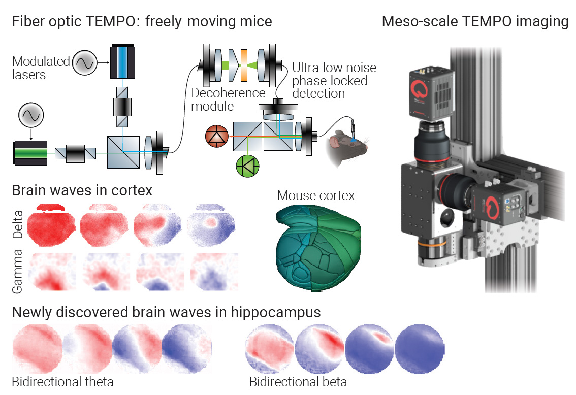 [Enlarge image]Two TEMPO optical platforms revealed cortical delta and gamma traveling waves and discovered bidirectional theta and beta waves in the hippocampus.