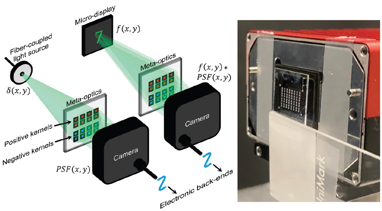 [Enlarge image]Left: Schematics of the experimental setup for point spread functions (PSFs) measurement and image convolution. Right: Photograph of the meta-optics and color camera used in the experiments.