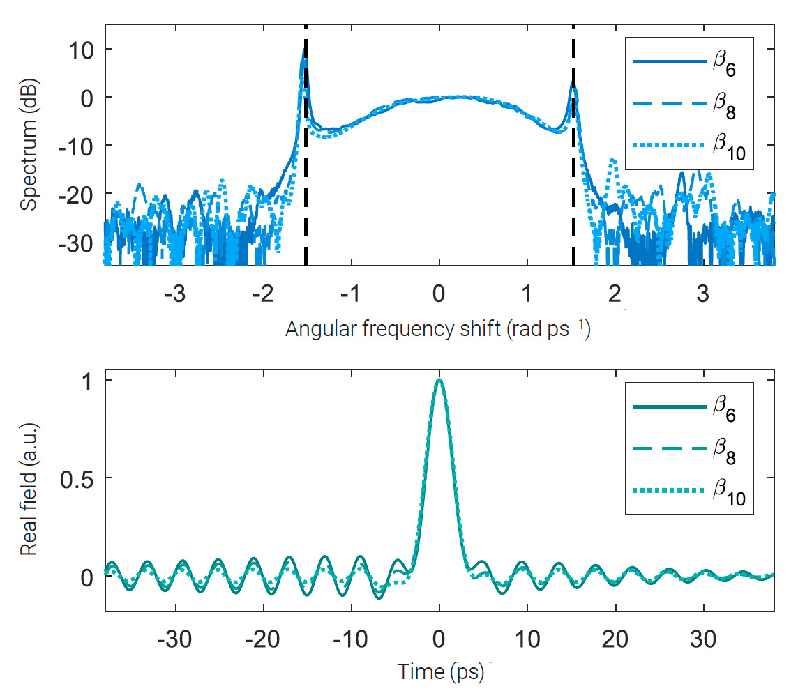 We recently carried out such experiments in our laboratory using a fiber laser that incorporates a spectral pulse shaper, which allows us to program in any type of dispersion.5 In one of our experiments, we measured the amplitude of the energy leakage of a pure quartic soliton, a soliton that balances the nonlinear Kerr effect with fourth-order dispersion, with three different types of coupling to the environment, indicated by β6, β8 and β10, with the same strength. We confirmed not only that the frequency of the leaked energy is the same in all cases, but also that the amplitude is approximately the same—both consistent with the predictions.2,5 Thus, in addition to the rigorous mathematical proof, we now have experimental confirmation of results that have been almost two centuries in the making.