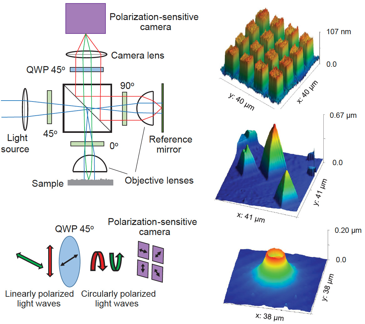 [Enlarge image]Left: Schematic of the single-shot wide-field interference microscope based on a Linnik interferometer (top). Illustration of the transformation of orthogonally polarized light into oppositely handed circular polarizations after the quarter-wave plate (bottom). Right: Examples of 3D surface reconstructions obtained from single-shot interference patterns: 100 nm atomic force microscope height standard (top), chemical vapor deposition diamond surface (center) and red blood cell (bottom). Image acquisition time 3 ms.