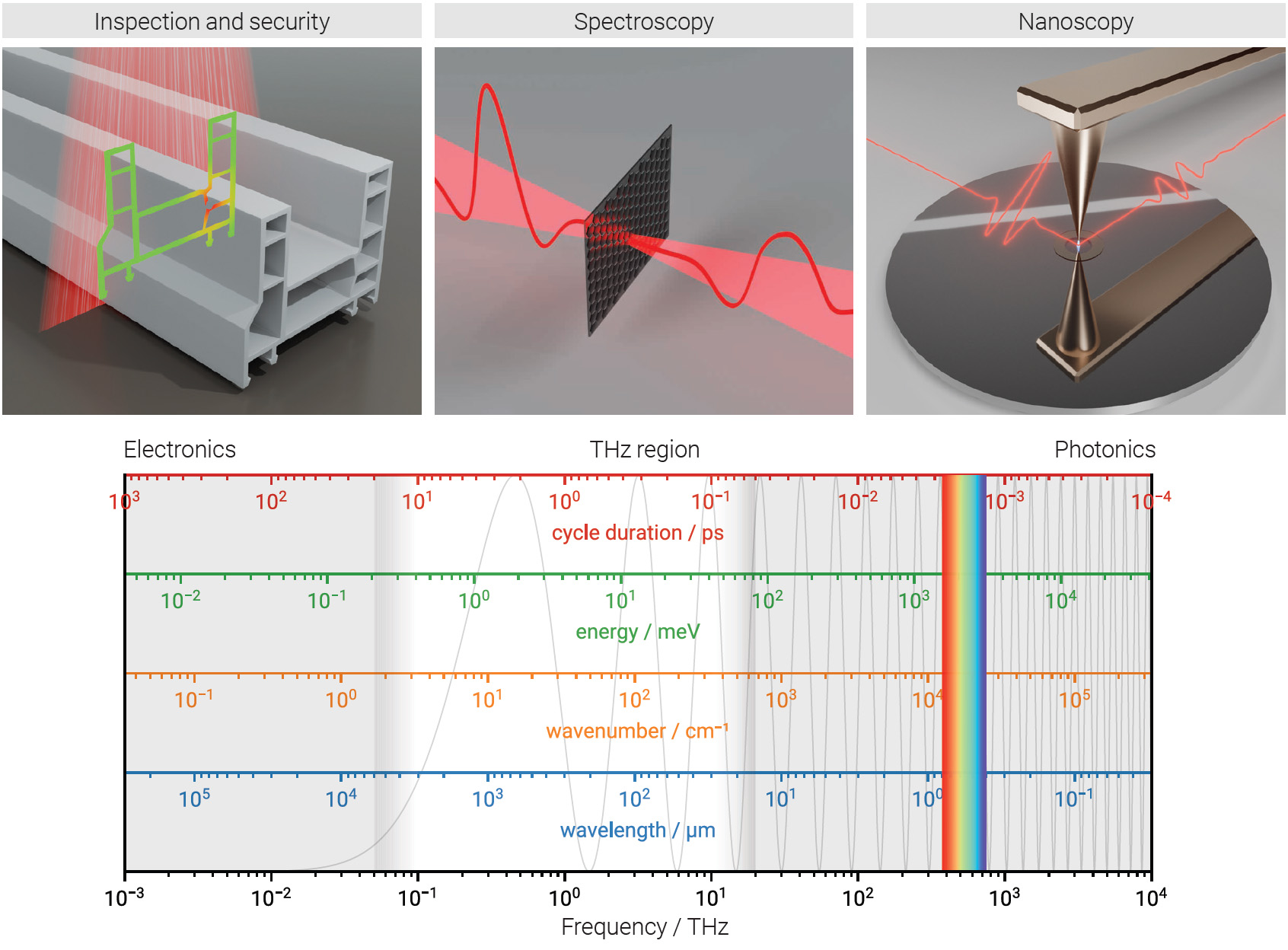 [Enlarge image]Some examples of modern applications of THz frequencies and the THz region in the electromagnetic spectrum. [M. Saraceno]