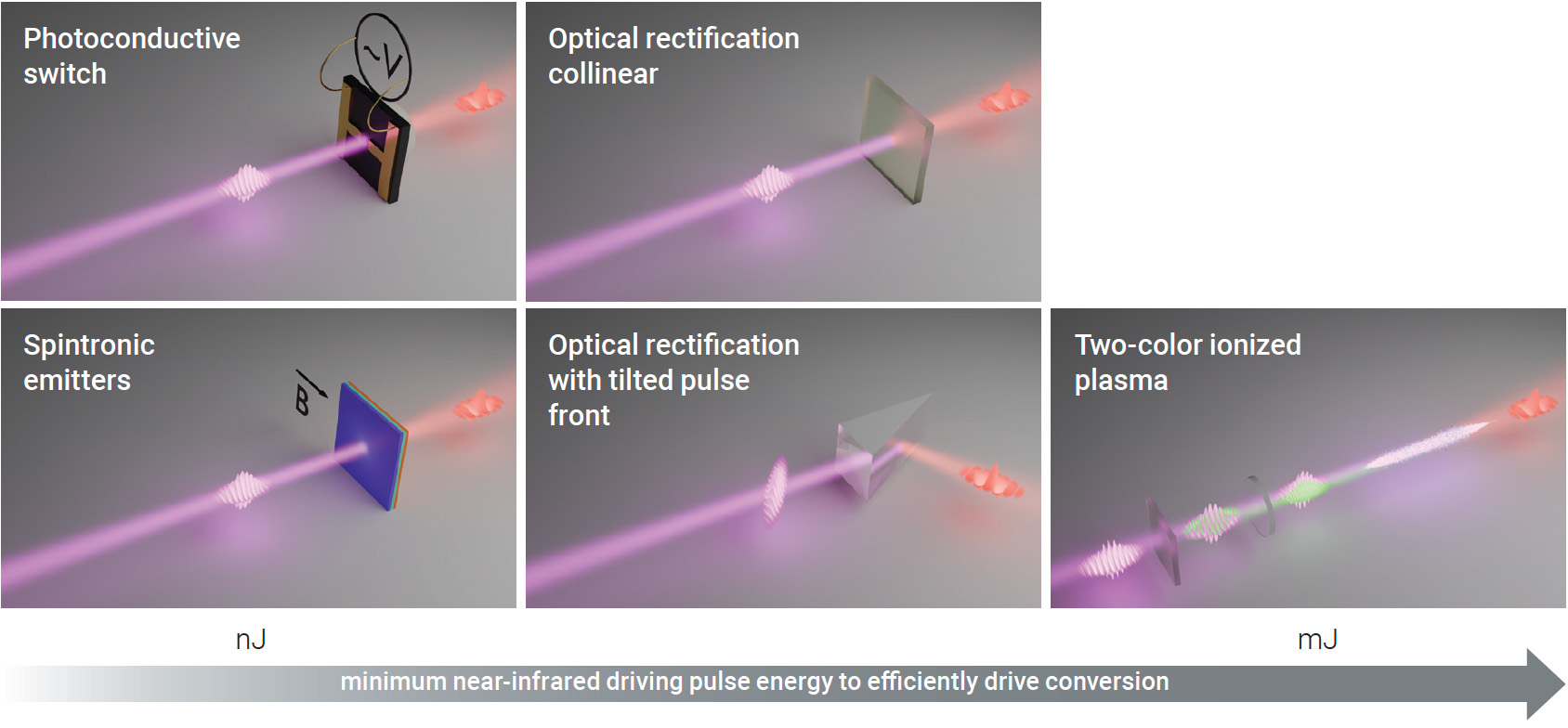 [Enlarge image]Most common methods for generating single-cycle THz pulses organized by typical pulse energy required to drive the conversion process. [M. Saraceno]