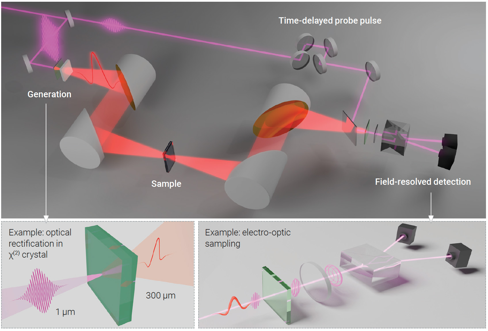 [Enlarge image]Schematic of terahertz time-domain spectroscopy using, as an example, optical rectification to generate THz transients and electro-optic sampling to detect the pulses in the time domain. [M. Saraceno]