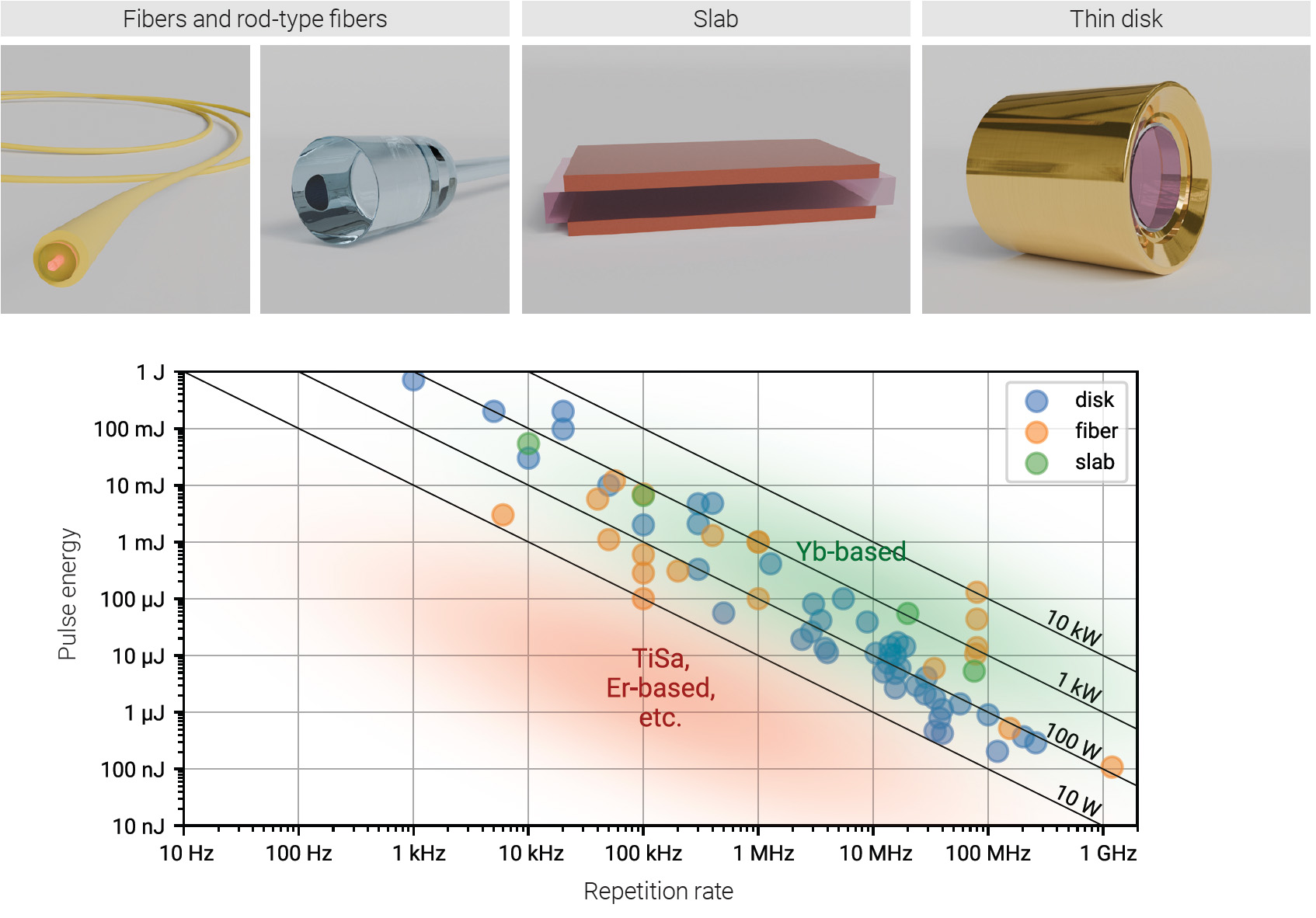 Over the past two decades, there has been spectacular progress in high-average-power ultrafast laser technology based on Yb lasers, providing hundreds of watts to kilowatts of average power across a wide range of repetition rates and pulse energies. Yb ions offer major advantages for high-power laser operation in different laser host materials, including a very small quantum defect—less than 10% of the difference between the pump and laser wavelengths, representing the strongest heat source in a laser—as well as long lifetimes and large emission and absorption cross-sections. These properties make Yb an ideal material that can be efficiently pumped with low-brightness, high-power diodes. When combined with advanced cooling geometries for the laser medium, such as heat-sinked disks, slabs and fibers, the Yb platform provides an excellent foundation for power scaling.