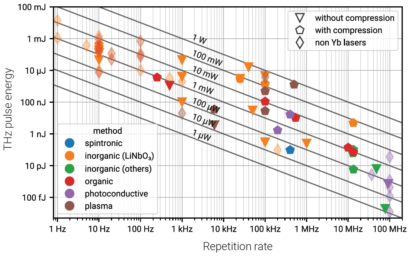 [Enlarge image]State of the art of laser-driven THz time-domain spectroscopy systems in terms of pulse energy and repetition rate. [Photonics and Ultrafast Laser Science Group, Ruhr University Bochum, Germany]