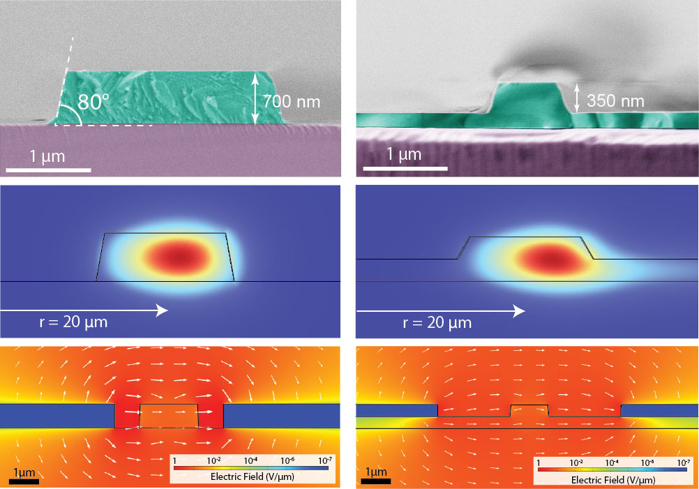 [Enlarge image]The fabrication technique developed by researchers at EPFL exploits a mask of diamond-like carbon to create fully etched waveguides (left) that are thicker and have steeper sidewalls than ridge waveguides (right). These strip waveguides confine light more tightly without introducing losses at the electrodes. [EPFL]