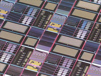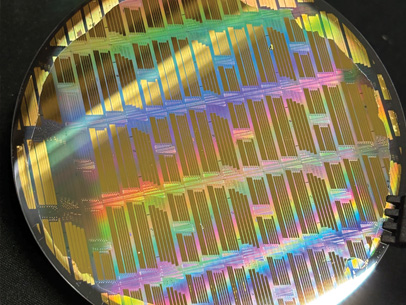 Photonic integrated circuits fabricated by Luxtelligence on a lithium tantalate wafer. [Luxtelligence]