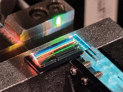 Although existing tools and techniques have provided a useful starting point for the Lumina team, operating at shorter wavelengths requires smaller components that place extra constraints on the fabrication process. Over the last two years, they have been working to reconfigure the process parameters to produce devices that deliver high-speed performance in this regime. “We are pioneering chip-scale integration at these wavelengths,” says Li. “At shorter wavelengths we’re still working to get the loss down, but we now have a relatively mature process that is producing the quality we need.”