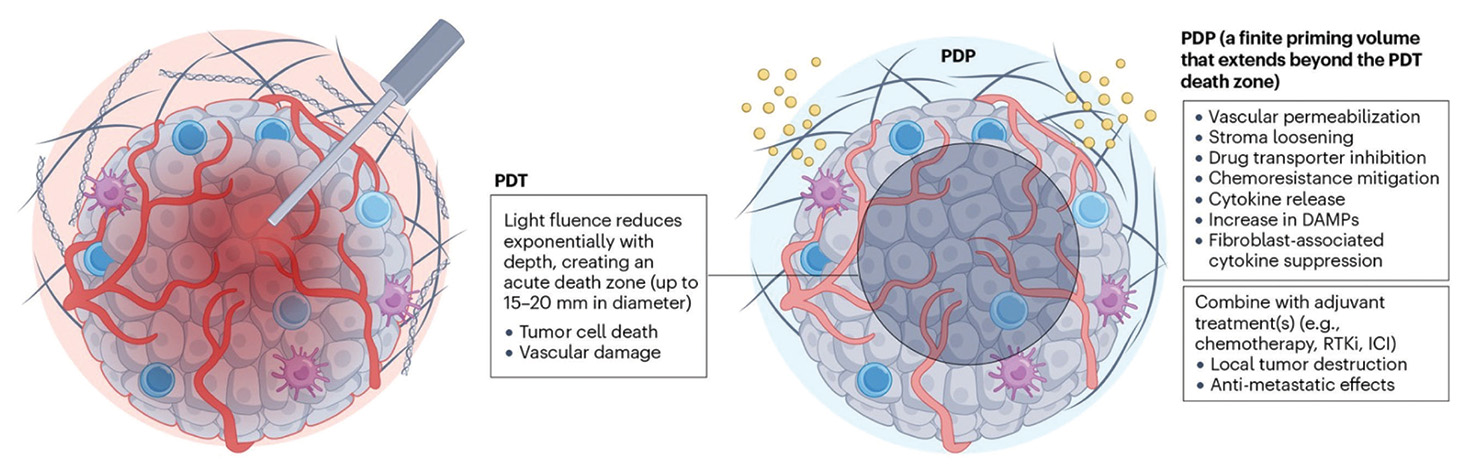 Beyond the zone of PDT-induced tissue death, known as the ablative zone, low light fluences combine with the photosensitizer to create a finite priming volume characterized by transient loosening of stroma, the supportive tissue surrounding a tumor, as well as more permeable vasculature. Essentially, this area of the tumor, and beyond, can become more sensitive to treatment modalities such as chemotherapy, radiation and immunotherapy.