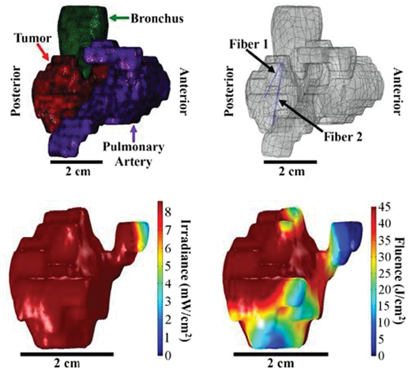 [Enlarge image]Image-based treatment plan for interstitial PDT of inoperable non-small-cell lung carcinoma with a malignant central airway obstruction. Top: 3D CT reconstruction of the tumor (left) and tumor geometry with planned insertion sites (right). Bottom: Simulated irradiance indicating 99% of the tumor will reach a 8.6 mW/cm² threshold (left) and simulated fluence showing 91.6% of the tumor will reach a 45 J/cm² threshold. [N.W. Ivanick et al. JTO Clinical and Research Reports 3, 100372 (2022)]