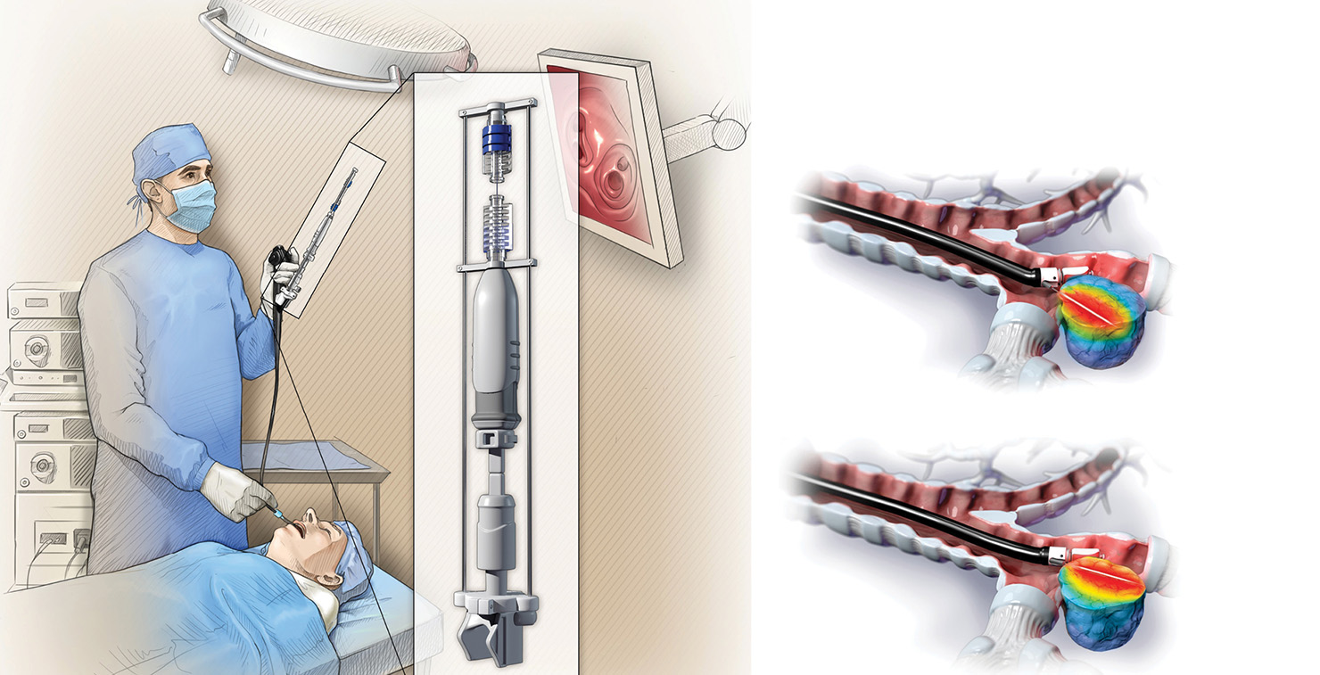 [Enlarge image]Left: Endobronchial ultrasound (EBUS) setup for fiber insertion into the target tumor. The inset shows the custom fiber holder mounted onto a standard transbronchial needle with an attachment through where the laser fiber is inserted. Right: The EBUS transbronchial needle is used to position the diffuser fiber for intratumoral illumination (top). A second insertion is made by pulling the fiber into the needle and then placing it in another location (bottom). Multiple insertions can be made during a procedure. [Printed with permission from © Roswell Park Comprehensive Cancer Center]