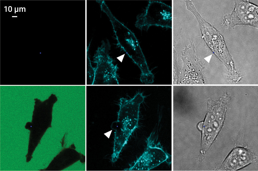 [Enlarge image]Plasma membrane impairment after laser bleaching in U87 cells treated with fluorescein or protoporphyrin. Post-irradiation images of control (top, left) and NaF treated cells (bottom, left) with plasma-membrane marker labeling (center). [C.S. Carrizo et al. Adv. Therap. 8, e00541 (2025)]