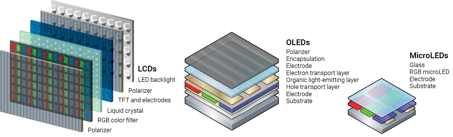 [Enlarge image]Schematic representation of the layered structure of liquid crystal displays (LCDs), organic LEDs (OLEDs) and microLEDs. [Getty Images / Adapted from Delmic]