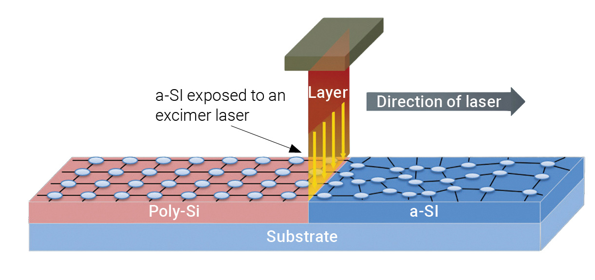 This is where excimer laser annealing (ELA) comes in. In a typical OLED panel, the backplane is built from thin layers of a-Si deposited on glass. But the electron mobility there would be insufficient for the requirements of OLED pixels. The a-Si layer must be transformed into low-temperature polysilicon (LTPS), a structure of small crystallites with more than a hundred times better electron mobility.