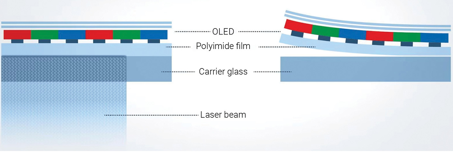 OLEDs are not just brighter and higher contrast than many LCD-based displays, they also enable flexible and foldable displays. The key procedure is laser lift-off (LLO), a laser-based release process that allows manufacturers to build the stack on rigid glass and then transfer it to a bendable substrate through a clean separation process that does not harm the volatile and flexible OLED stack.