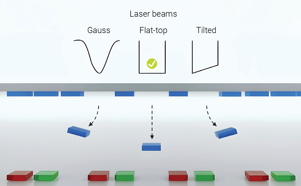 Excimer laser annealing is a masterpiece of innovative technology. The excimer’s rectangular beam is replicated, homogenized and shaped into thin lines by special micro-optics.