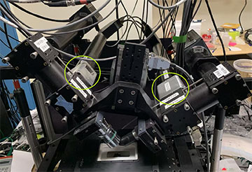 The polarized diSPIM. Liquid crystals used for polarized illumination are shown in green circles. The diSPIM’s dual-view paths meet at a right angle on the sample. [IMAGE: Min Guo]